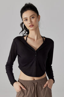 For happy hour cocktails, style Kibra's Thread Short Sleeves with an oversized blazer, silk cami, strappy heels, and a sleek ponytail. Edgy activewear work for evening wear.