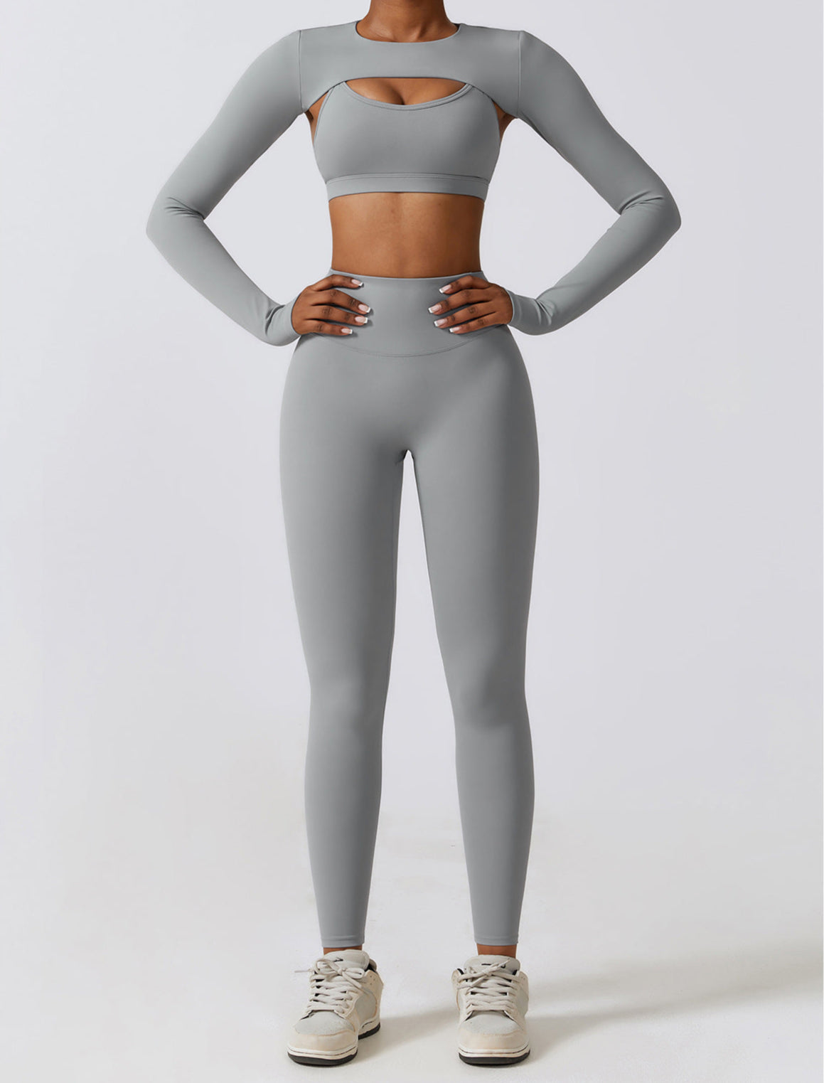 キブラのクラシックセット(ジャケット、ブラ、レギンス)を着ています! シルエットがすごく良くて、動きやすさも最高です 🥹💪 グレーのMサイズを選びました 🩶💙 トレーニングのモチベーションが爆上がりです!!🔥