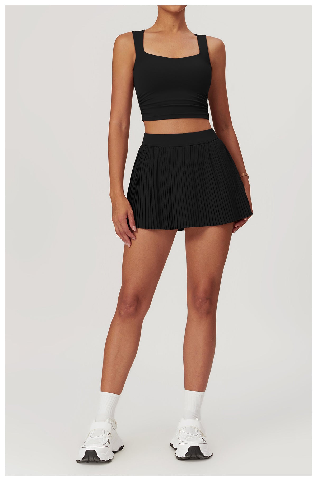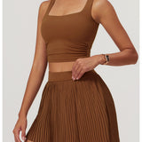 Elevate your casual wardrobe with this supremely comfortable and stylish top. Crafted from a cloud-like nylon and spandex blend, the luxuriously soft fabric flows effortlessly over your curves for a flattering, figure-skimming fit. Subtle pleats at the waist create gentle definition, while the open neckline elegantly showcases your collarbones. For added versatility, removable chest pads allow you to easily transition from the gym to the streets. With its premium feel, modern design, and thoughtful details, this top promises to become your new go-to for looks that are as comfortable as they are chic.